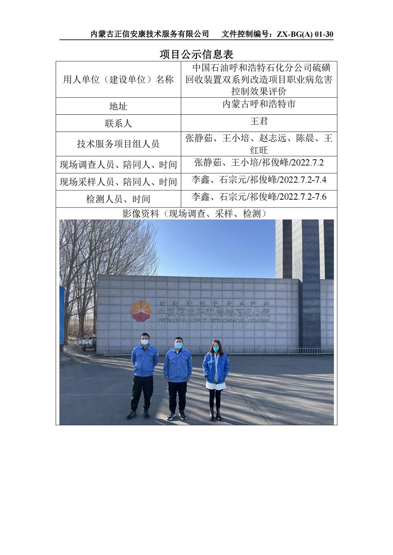 中國(guó)石油呼和浩特石化分公司硫磺回收裝置雙系列改造項(xiàng)目職業(yè)病危害控制效果評(píng)價(jià)