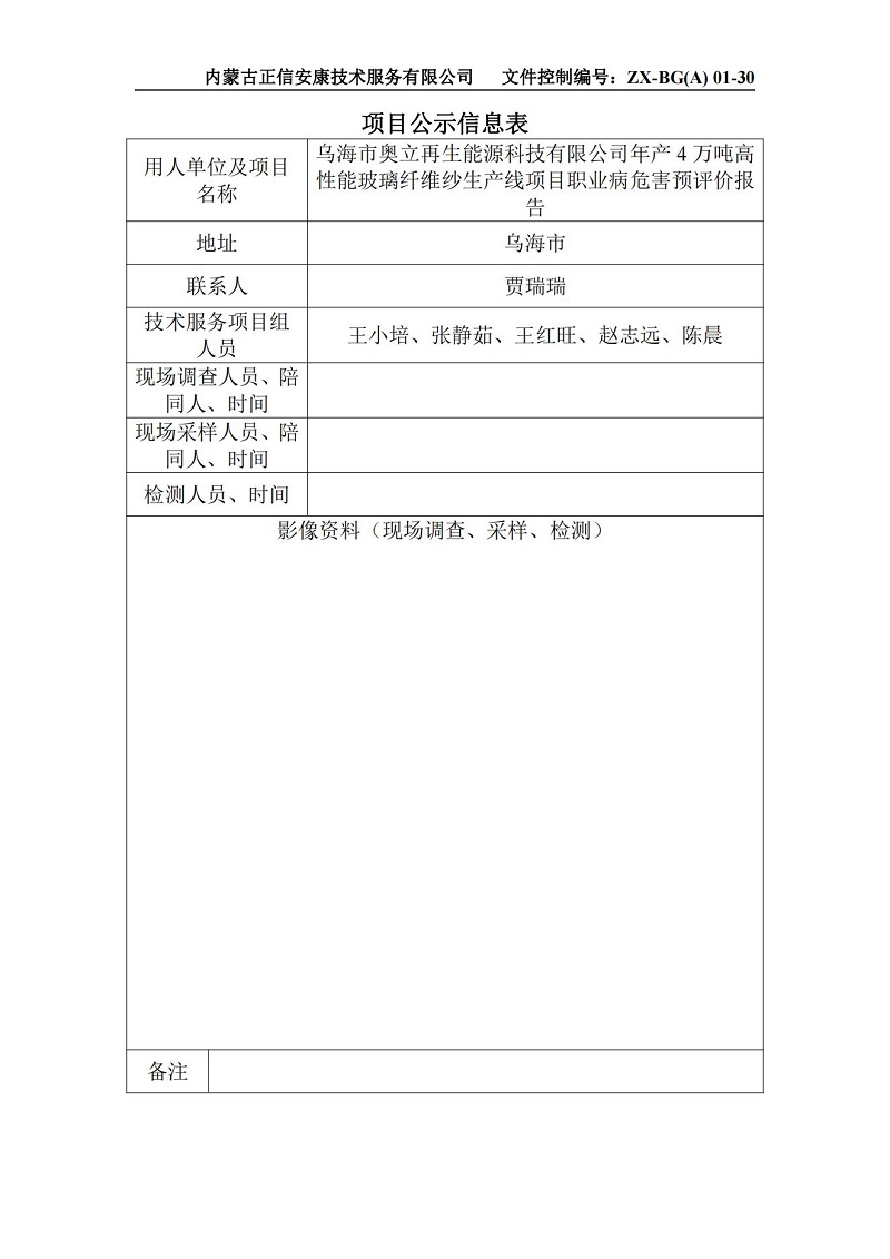 烏海市奧立再生能源科技有限公司年產(chǎn)4萬噸高性能玻璃纖維紗生產(chǎn)線項目職業(yè)病危害預評價報告公示信息表