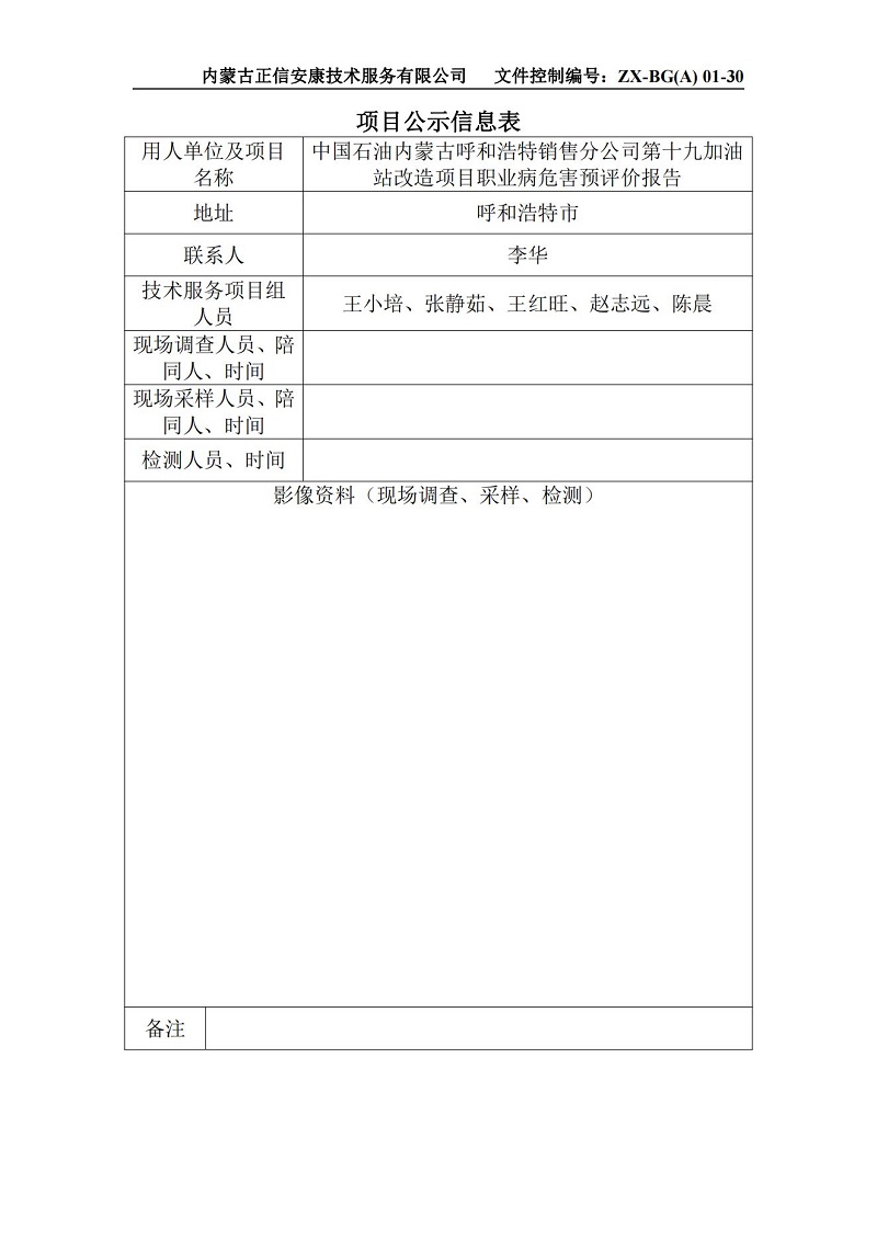 中國石油內(nèi)蒙古呼和浩特銷售分公司第十九加油站改造項目職業(yè)病危害預(yù)評價報告公示信息表