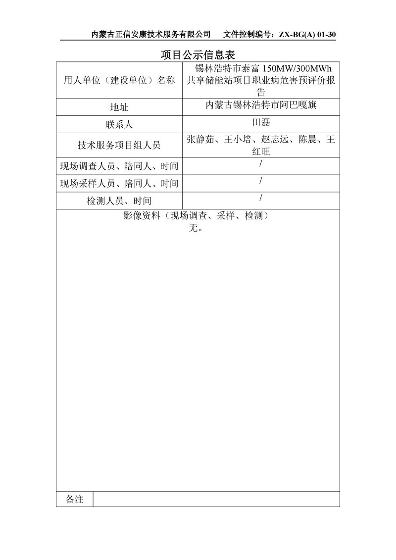 錫林浩特市泰富150MW300MWh共享儲能站項目職業(yè)病危害預評價公示信息