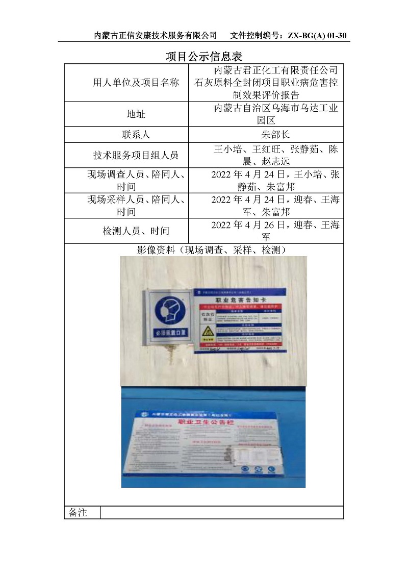 內蒙古君正化工有限責任公司石灰原料全封閉項目職業(yè)病危害控制效果評價報告信息公示表