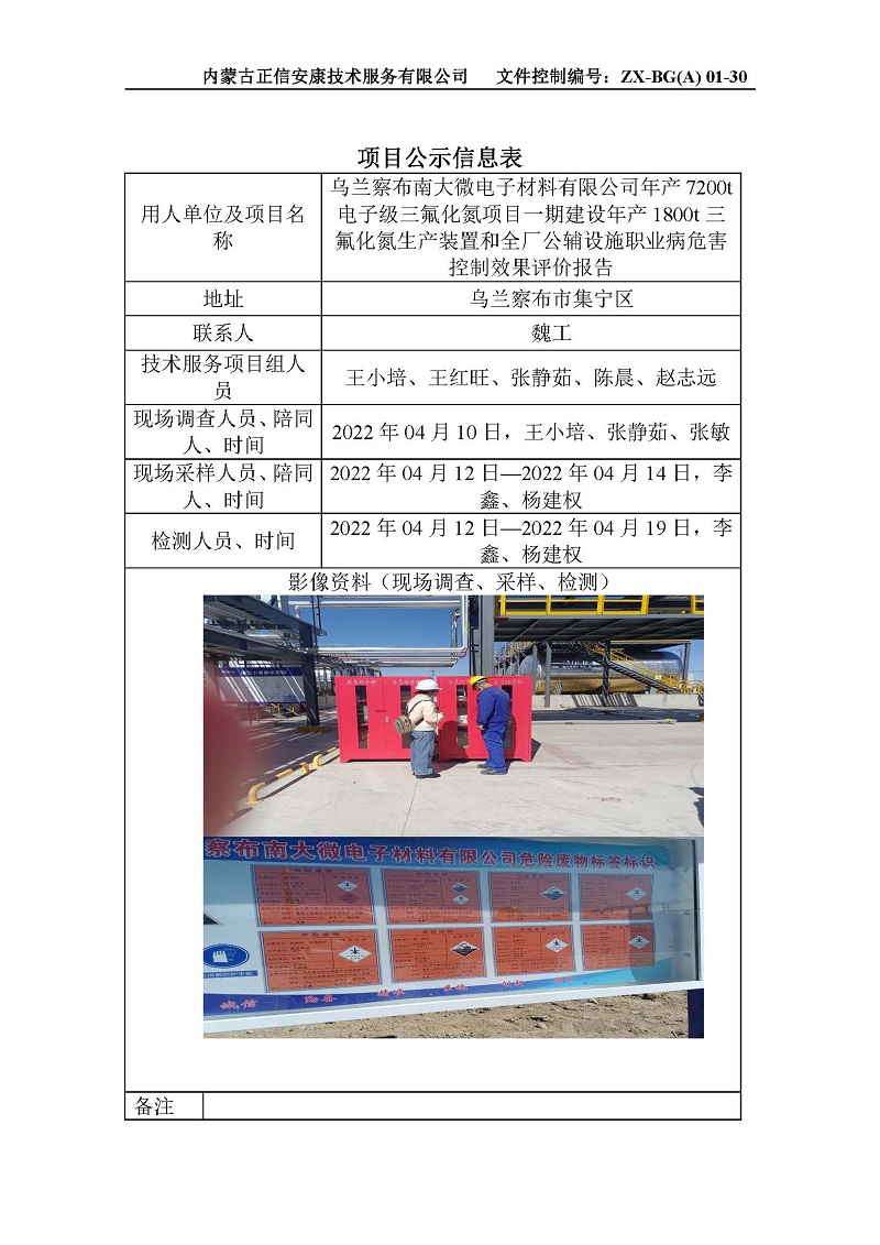 烏蘭察布南大微電子材料有限公司年產(chǎn)7200t電子級三氟化氮項(xiàng)目信息公示表