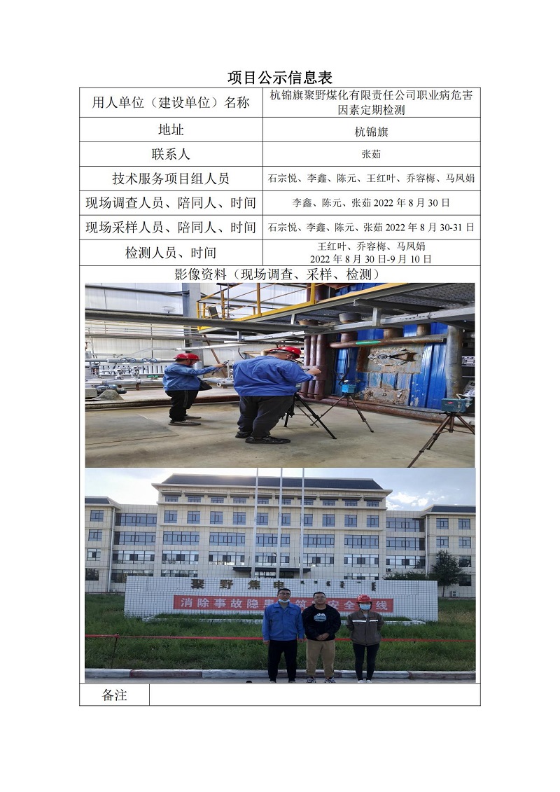 杭錦旗聚野煤化有限責(zé)任公司職業(yè)病危害因數(shù)定期檢測項(xiàng)目公示