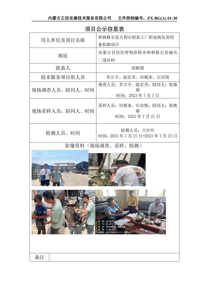 和林格爾縣天利石材加工廠職業(yè)病危害因素檢測項目公示信息表_
