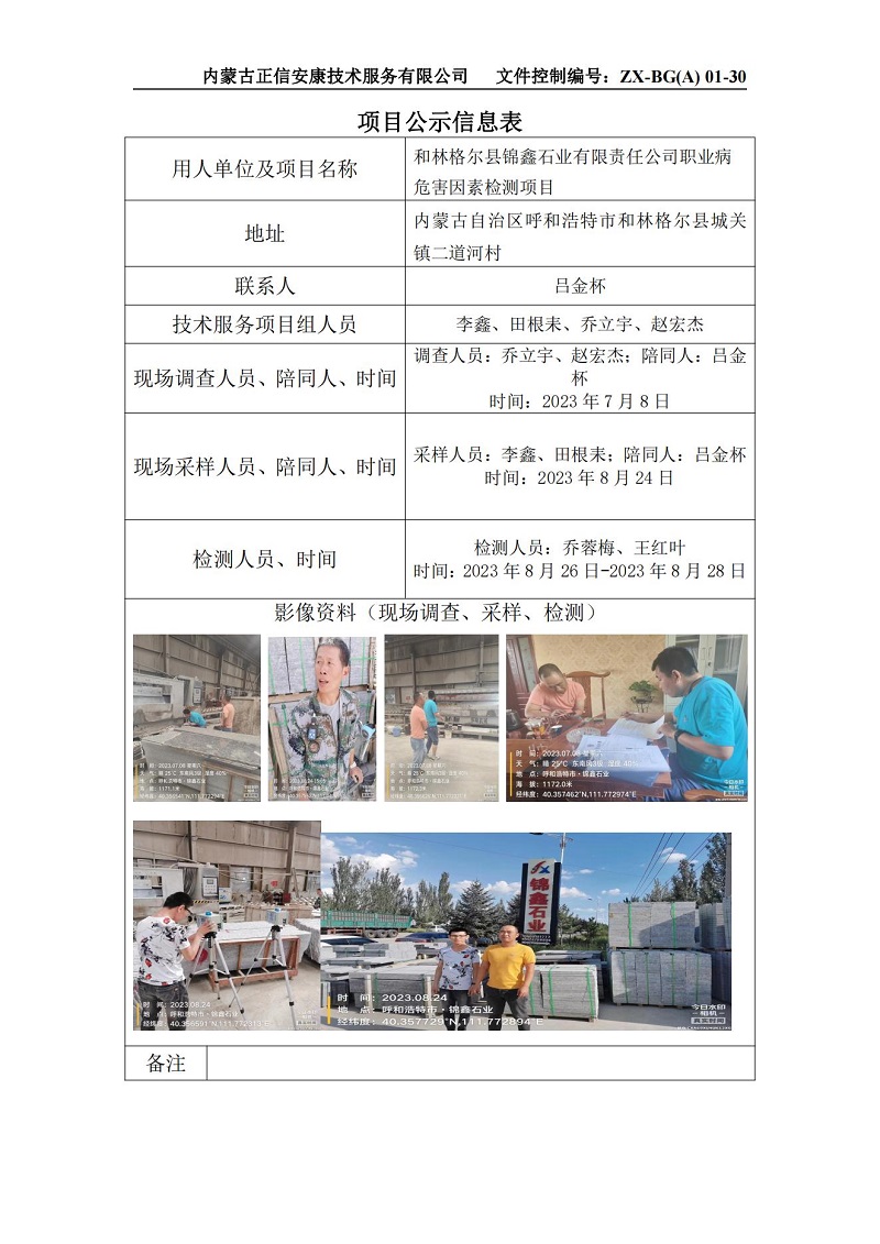 和林格爾縣錦鑫石業(yè)有限責任公司職業(yè)病危害因素檢測項目公示信息表