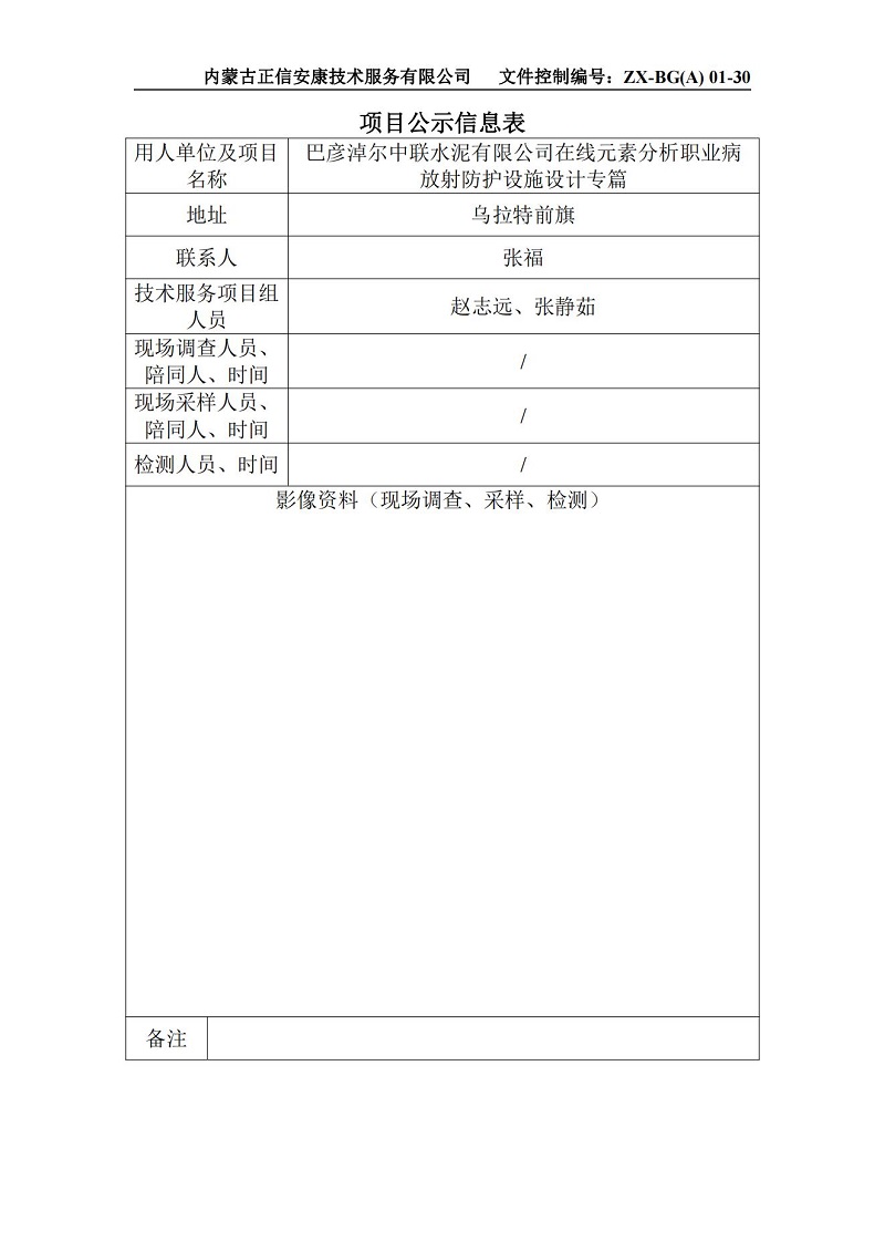 巴彥淖爾中聯(lián)水泥有限公司在線元素分析職業(yè)病放射防護(hù)設(shè)施設(shè)計(jì)專篇-項(xiàng)目公示信息表