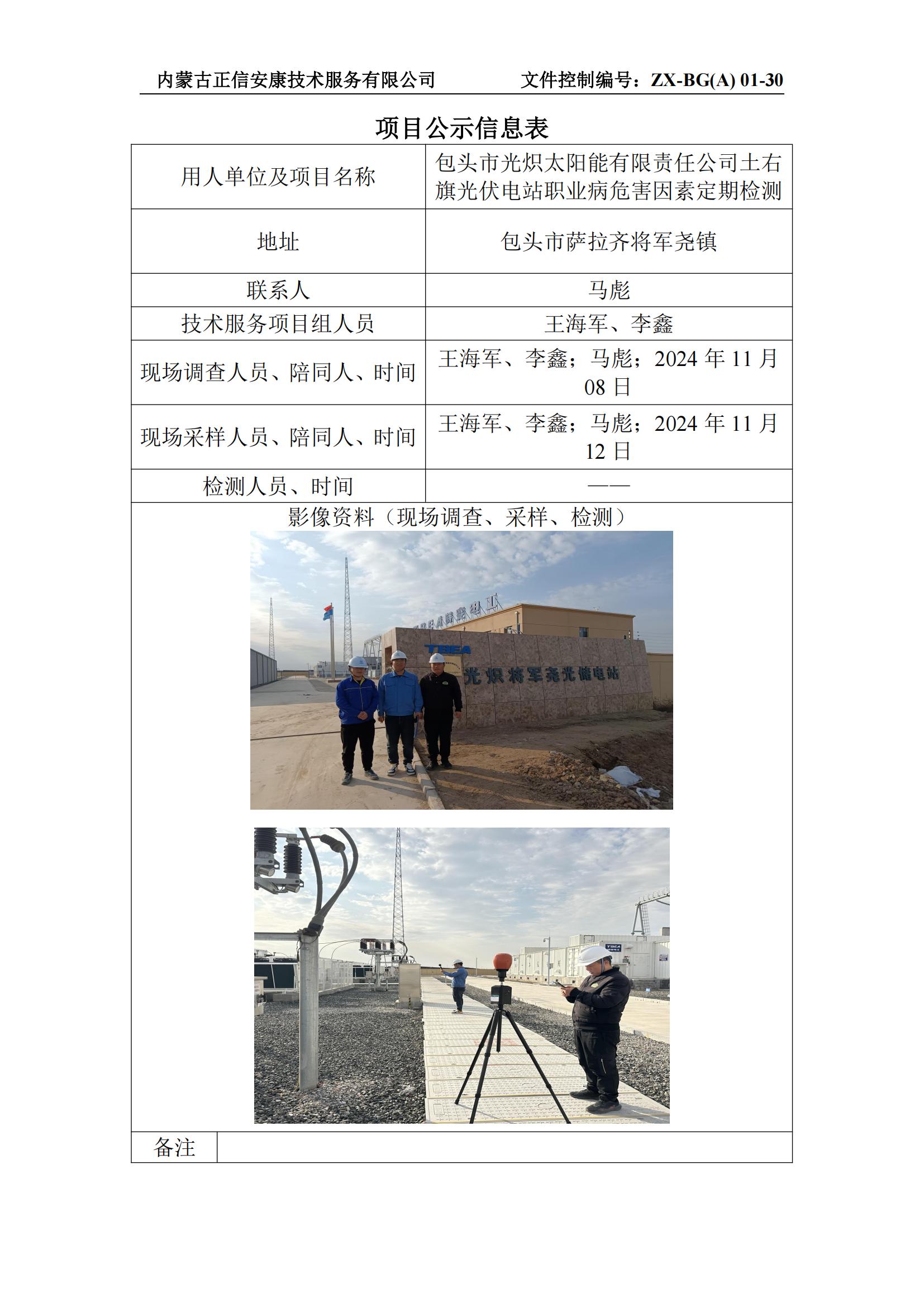 包頭市光熾太陽能有限責任公司土右旗光伏電站職業(yè)病危害因素定期檢測