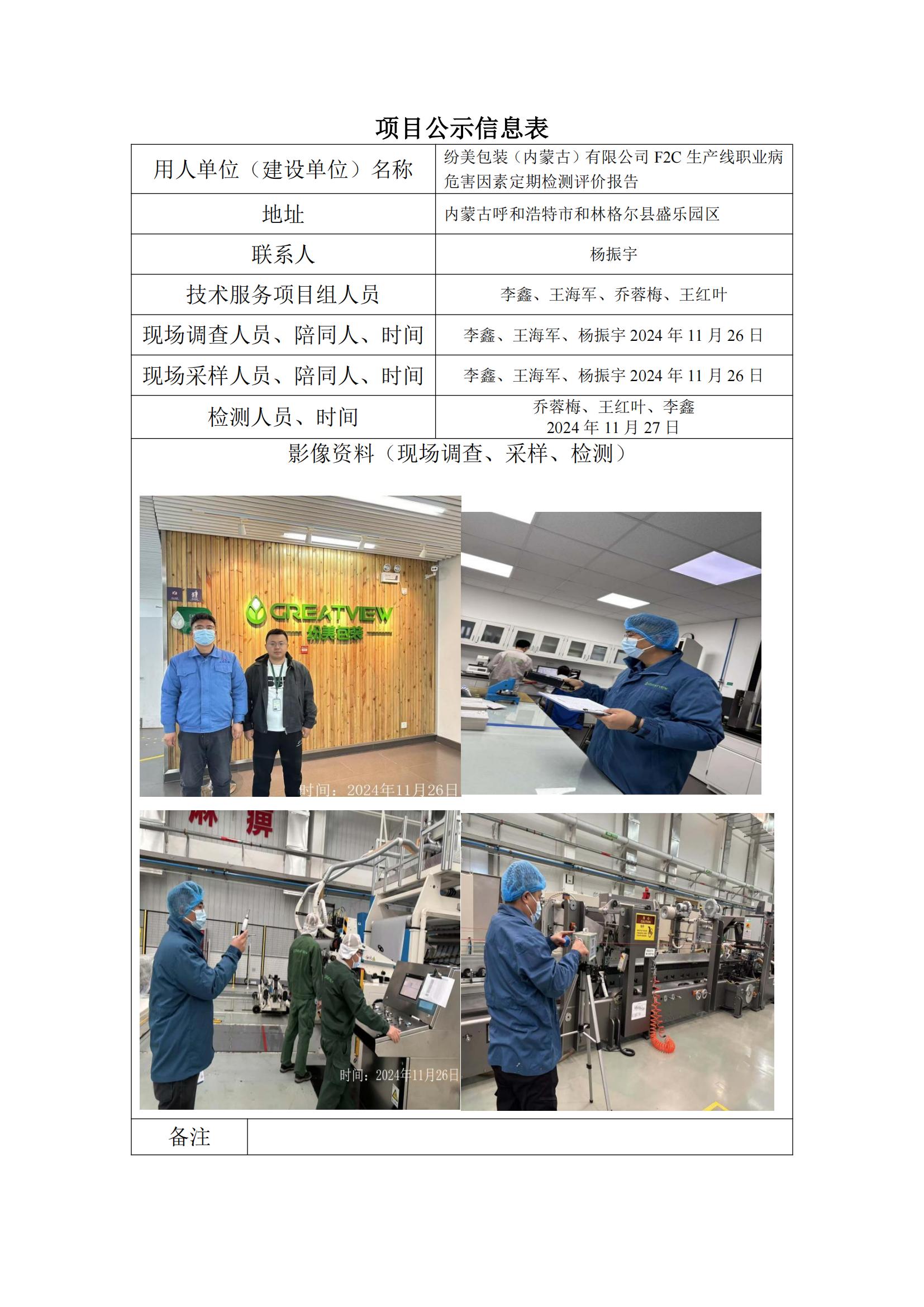 紛美包裝(內蒙古)有限公司 F2C 生產線職業(yè)病 危害因素定期檢測評價報告