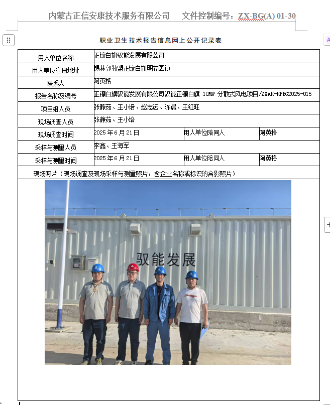 正鑲白旗馭能發(fā)展有限公司馭能正鑲白旗 10MW 分散式風(fēng)電項目職業(yè)病危害控制效果評價