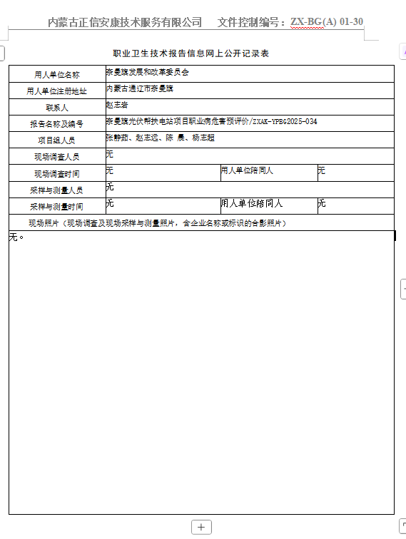 奈曼旗光伏幫扶電站項目職業(yè)病危害預評價